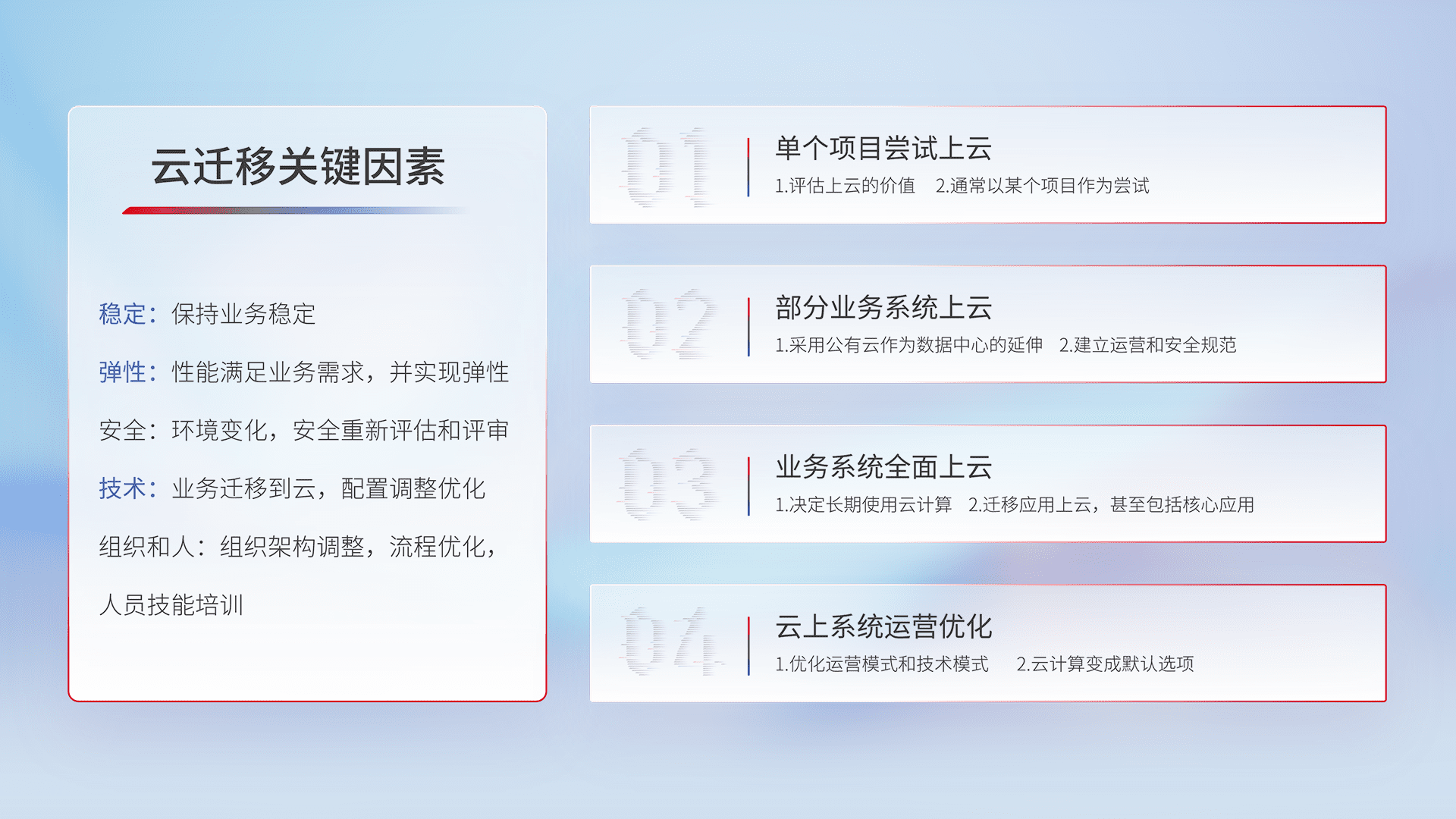 结合实际业务,,,,从规划设计、、云平台选型、、、、云原生改造、、、、数据迁移、、集成交付,,,,迁移全过程为客户识别最佳上云路径,,,,做好风险识别管理,,设计网络架构、、身份权限、、、安全审计合规、、、、操作审计、、、日志审计、、监控告警策略、、、多站点容灾设计等,,,,对云上基础设施进行整体规划,,提升IT治理水平,,,,以满足弹性、、高可用、、、、高性能的需求。。。