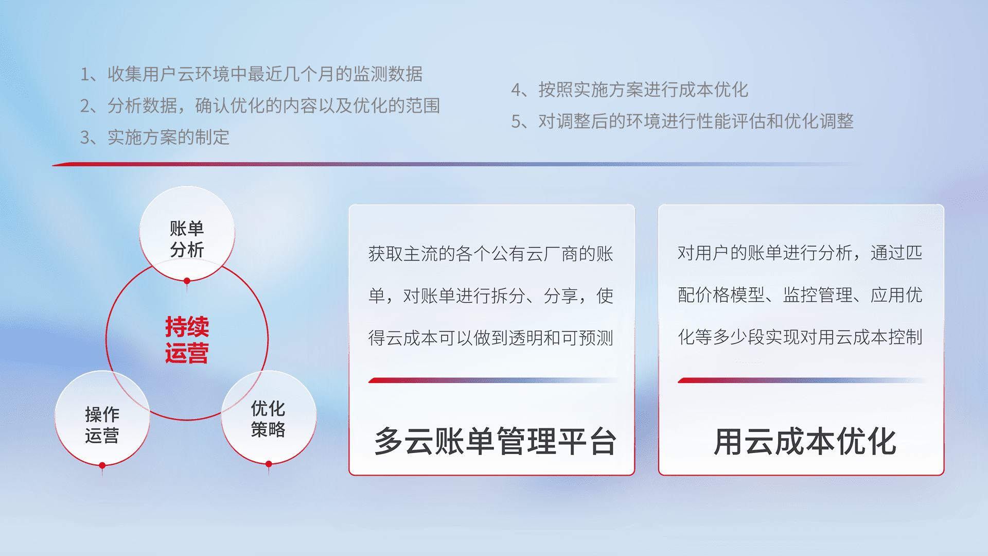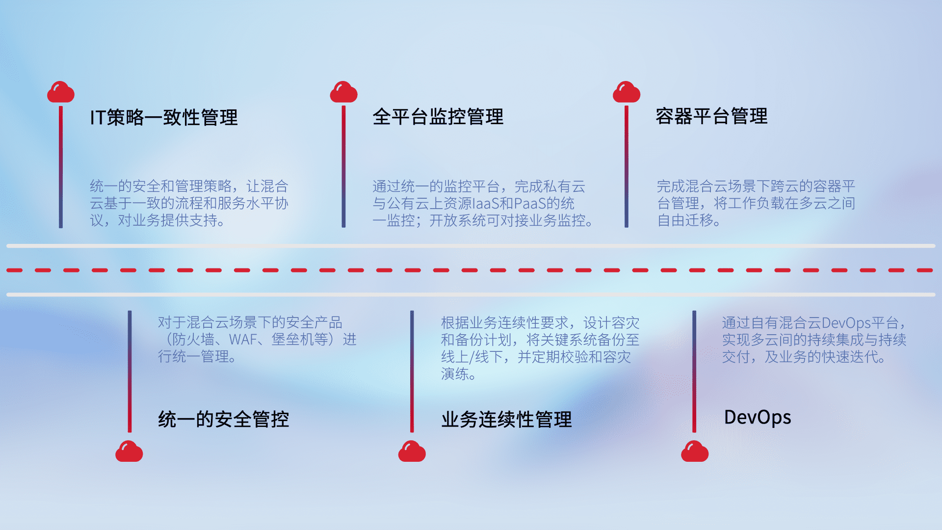 通过多云纳管,,以统一的资源数据模型把客户的云资源进行抽象和封装,,,进而实现对多云资源的统一操作,,,保障云资源管理的可靠性、、、、稳定性与可用性。。量身定制化运维内容,,配置、、、、开发运维、、、、补丁管理、、、备份、、、、监控、、认证和访问管理、、、审计和日常巡检等,,,保障在用云过程中的可靠度,,,稳定度以及高可用率。。